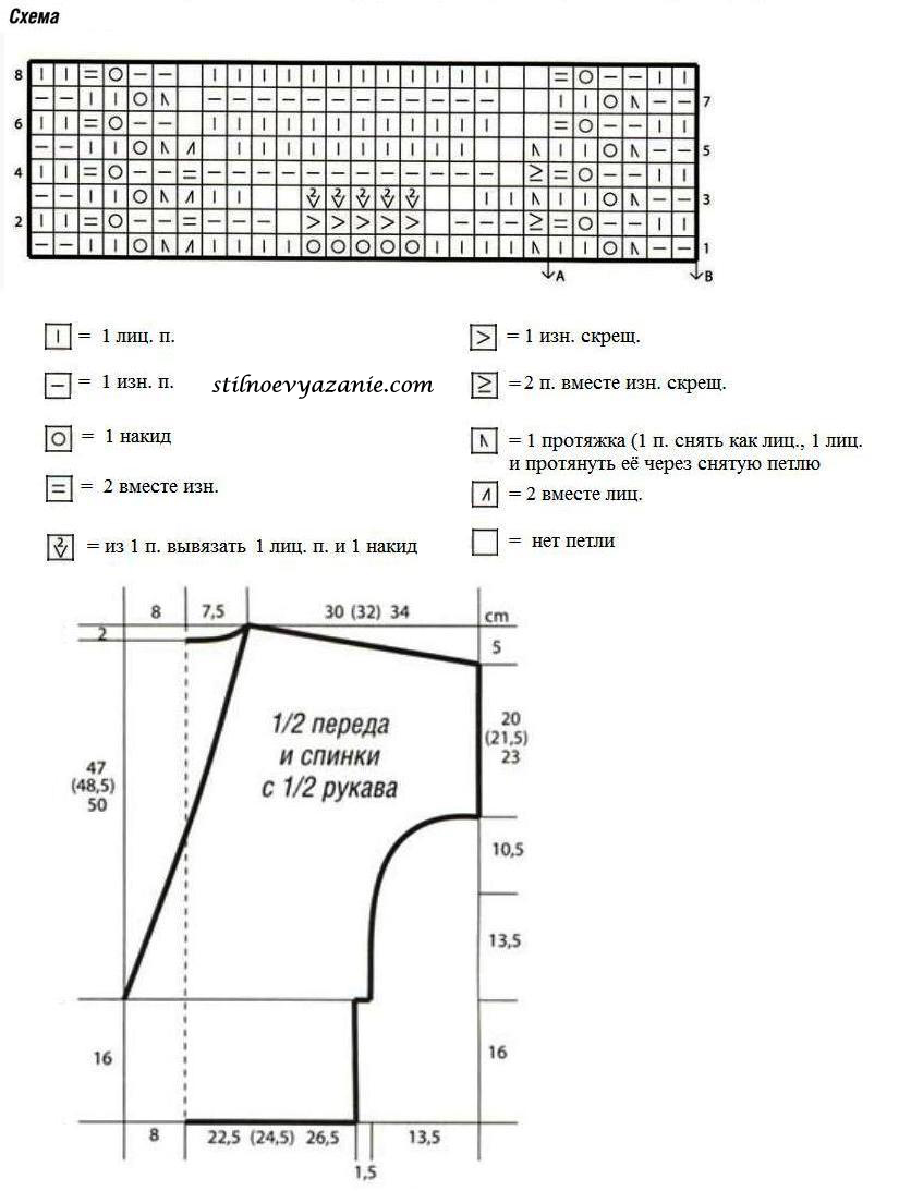 Спинка : набрать 114 (124) 134 п. и связать 16 см резинкой. В последнем р. равномерно убавить 16 п. = 98 (108) 118 п. Затем вязать основным узором, распределив петли след. образом: кром., 5 (10) 15 лиц., 24 п. ажурного узора, 38 лиц., 24 п. ажурного узора, 5 (10) 15 лиц., кром. Через 13.5 см от резинки прибавить или заново набрать с обеих сторон для цельновязаных рукавов 1 п., затем в каждом 4-м р. 1 х 1 п. и в каждом 2-м р. еще 6 x 1, 2 х 2, 2 х 3, 1 х 4, 1 х 5 п. = 152 (162) 172 п. Первые 16 из прибавленных петель вязать лиц. гладью. Остальные прибавленные петли распределить след. образом: 2 изн., 6 п. по схеме от стрелки А до стрелки В, 3 лиц. Через 44 (45.5) 47 см от резинки отложить в каждом 2-м р. для скоса плеча 5 х 6 (6) 7, 1 х 9 (12) 12 и 1 х 22 (24) 24 п. Через 47 (48,5) 50 см от резинки закрыть для выреза горловины средние 20 п. и обе стороны закончить раздельно. Для закругления выреза горловины закрыть с внутреннего края в каждом 2-м р. 1 х 3 и 1 х 2 п. Общая длина = 65 (66,5) 68 см.