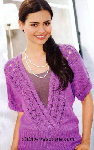 Перед: вязать, как спинку, только после резинки обе половины вязать раздельно, сначала вязать правую при носке часть переда. Для этого первые 33 (38) 43 п. отложить и след. 65 (70) 75 п. распределить след. образом: кром., 3 лиц., 24 п. ажурного узора, 36 (41) 46 лиц., кром. Для скоса выреза горловины закрыть в каждом 2-м р. с правого края после ажурного узора 2 х 1 п., в каждом 4-м р. 26 х 1 п. и в кажом 6-м р. 3 х 1 п. Прибавления для рукава, распределение петель для рукава и скос плеча выполнить с левого края, как для спинки. Общая длина = 65 (66,5) 68 см. Для левой части переда включить в работу отложенные петли и для припуска заново набрать 32 п. = 65 (70) 75 п. Петли распределить след. образом: кром., 36 (41) 46 лиц., 24 п. ажурного узора, 3 лиц., кром. Скос выреза горловины с левого края выполнить как для правой части. Прибавления для рукава, распределение узоров для рукава и скос плеча с правого края выполнить, как для спинки. Общая длина = 65 (66.5) 68 см.